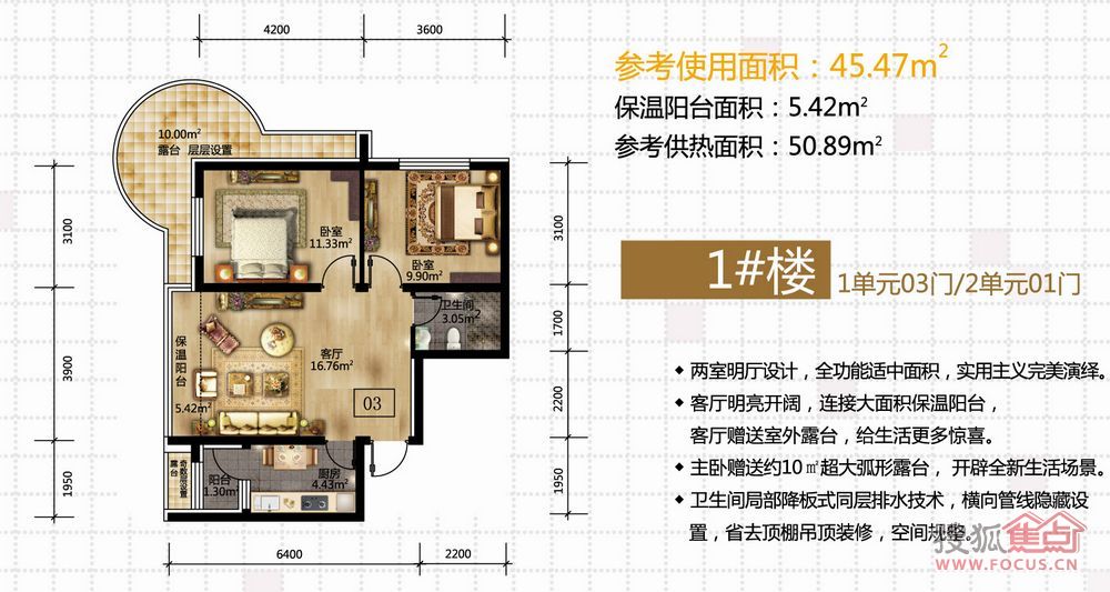 2室1厅1卫-富达蓝山1#楼两室一厅一卫45.47㎡