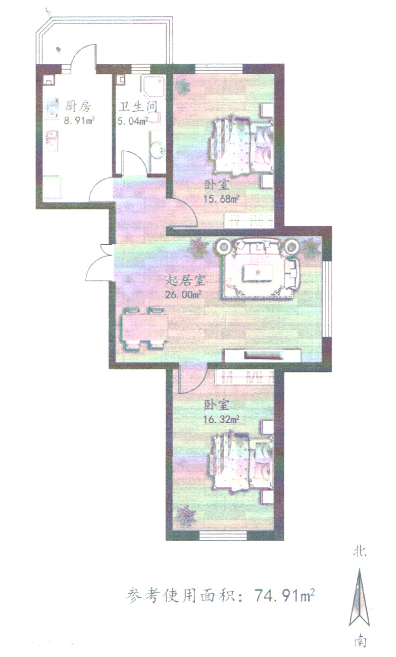 2室1厅1卫-74.91平米两居