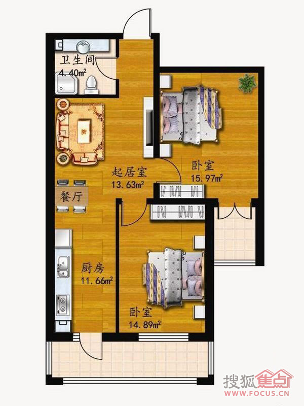 2室1厅1卫-64.97平米两居