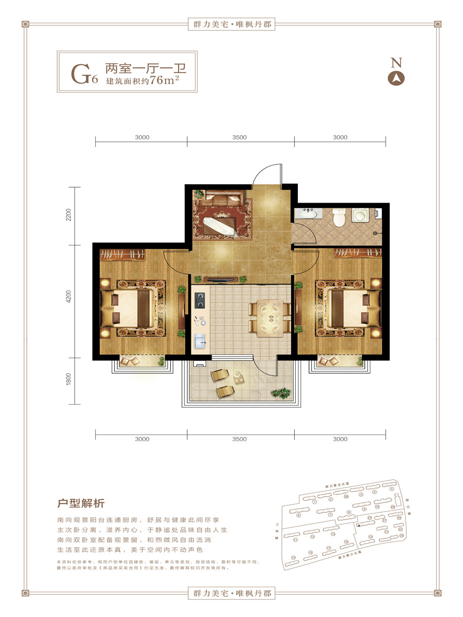 2室1厅1卫-高层建面76平米两室一厅一卫G6户型