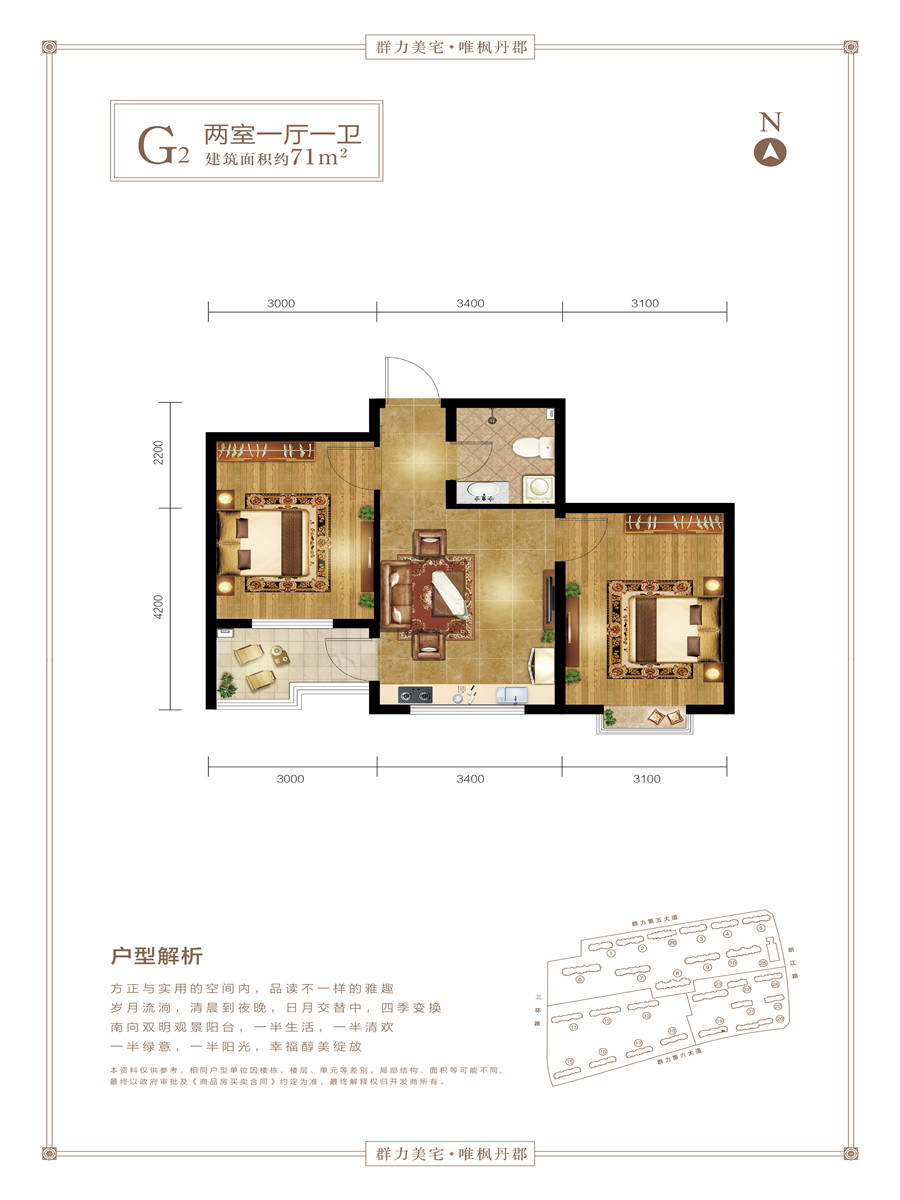 2室1厅1卫-高层建面71平米两室一厅一卫G2户型