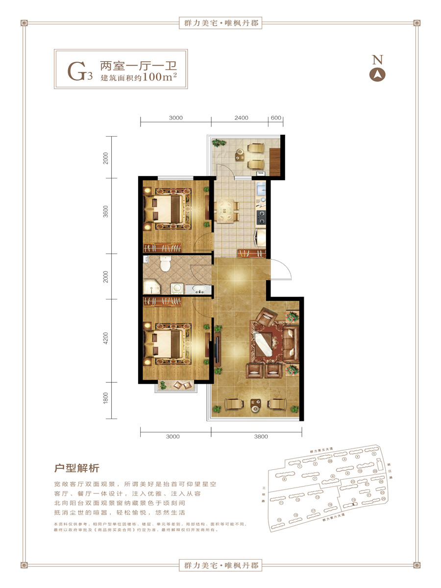 2室1厅1卫-高层建面100平米两室一厅一卫G3户型