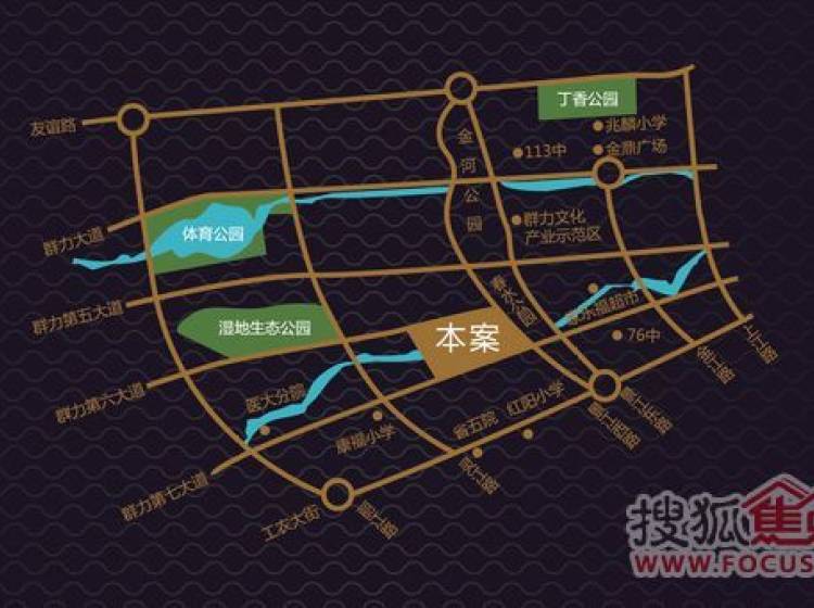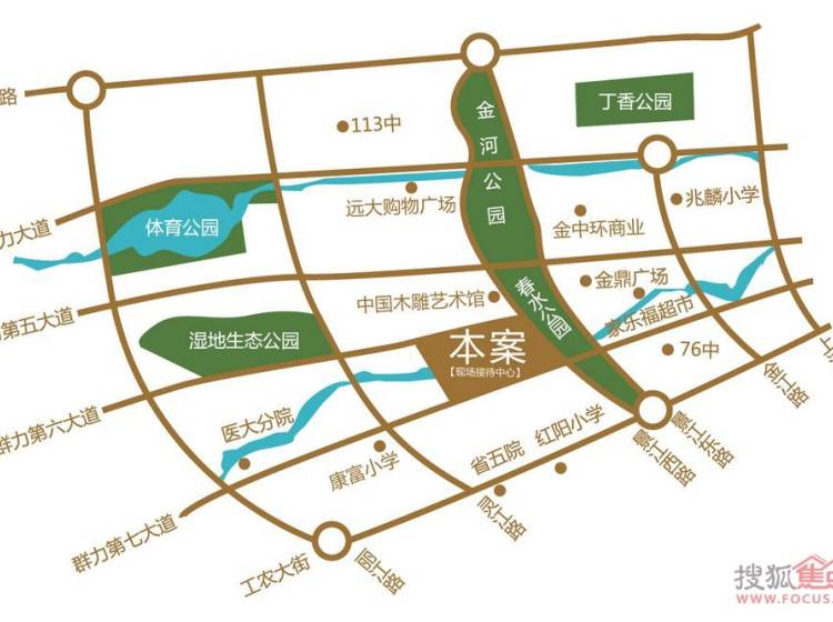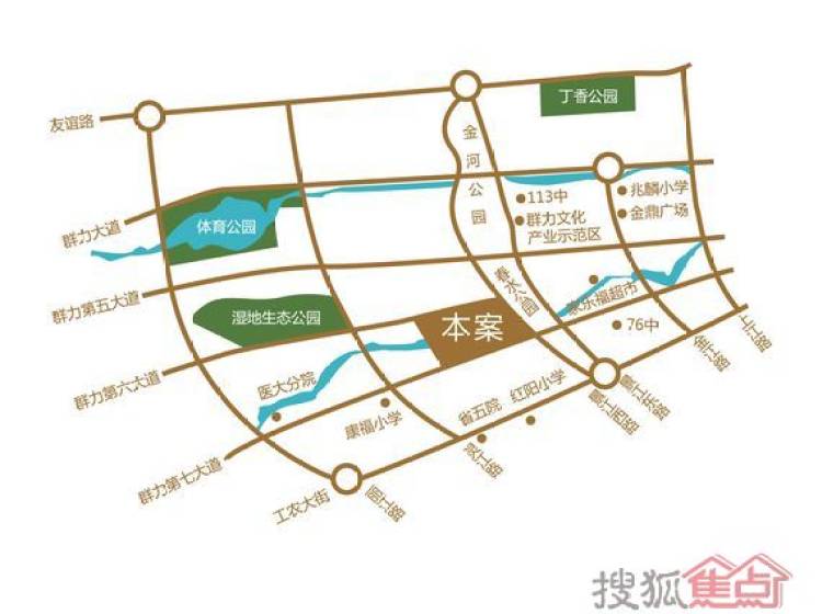 休闲配套:春水公园、丁香公园、雨阳公园、体育主题公园、湿地公园、叠水剧场、内河景观走廊、长岭湖湿地公园、群力体育中心