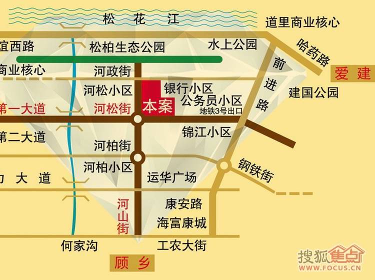 哈药路直行进入前进路段,右转驶入河松街,直行至河山街路口即可到达项目。