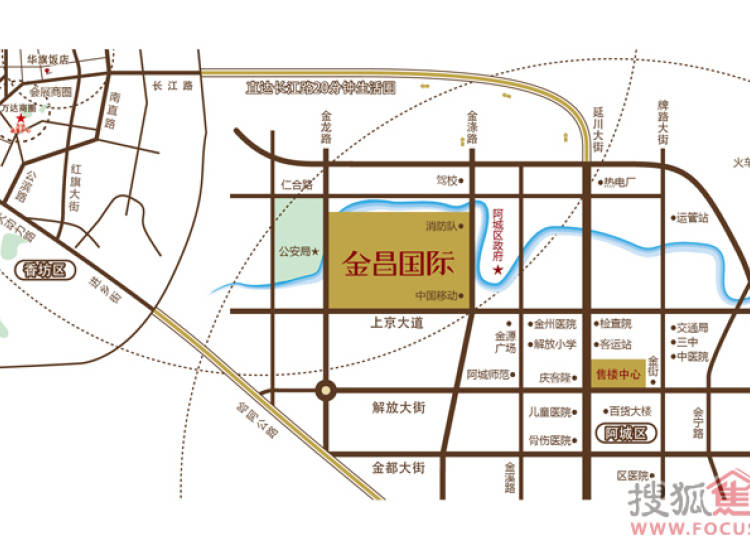 金昌国际位于阿城首站上京大道。做为阿城政务区主干道,区政府、公安局、检察院等政府机关均设立于此。同时,项目位于长江路进入阿城区的首站,驱车很快即可抵达哈尔滨会展商圈。
