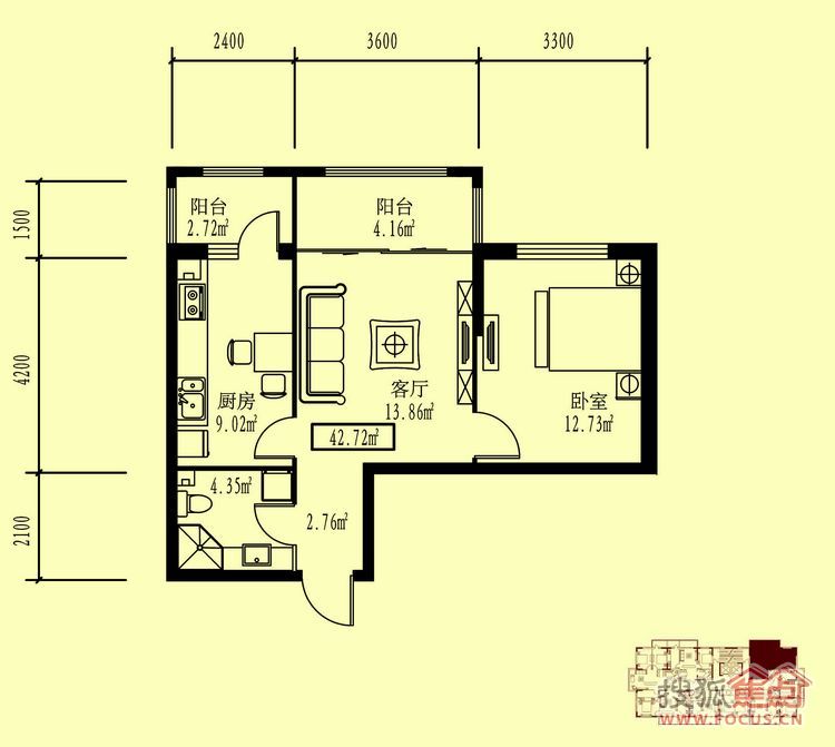 1室1厅1卫-先锋领地一室一厅一卫42.72㎡户型
