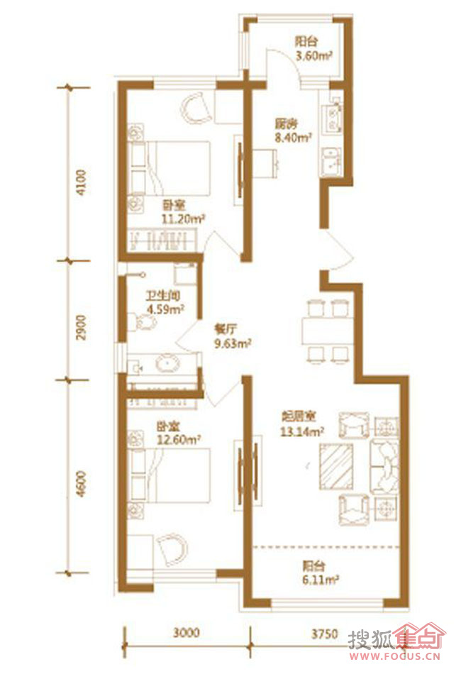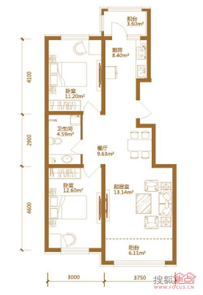 2室2厅1卫-两室两厅一卫一厨94.16㎡户型