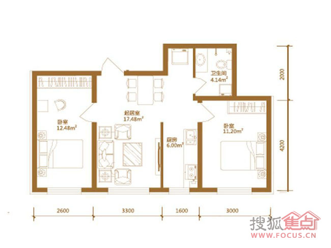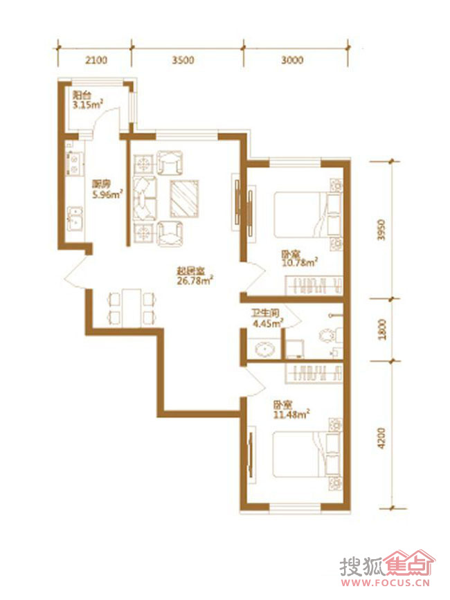2室2厅1卫-两室两厅一卫一厨83.90㎡户型