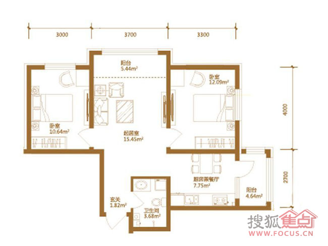 1室2厅1卫-一室两厅一卫一厨61.77㎡户型