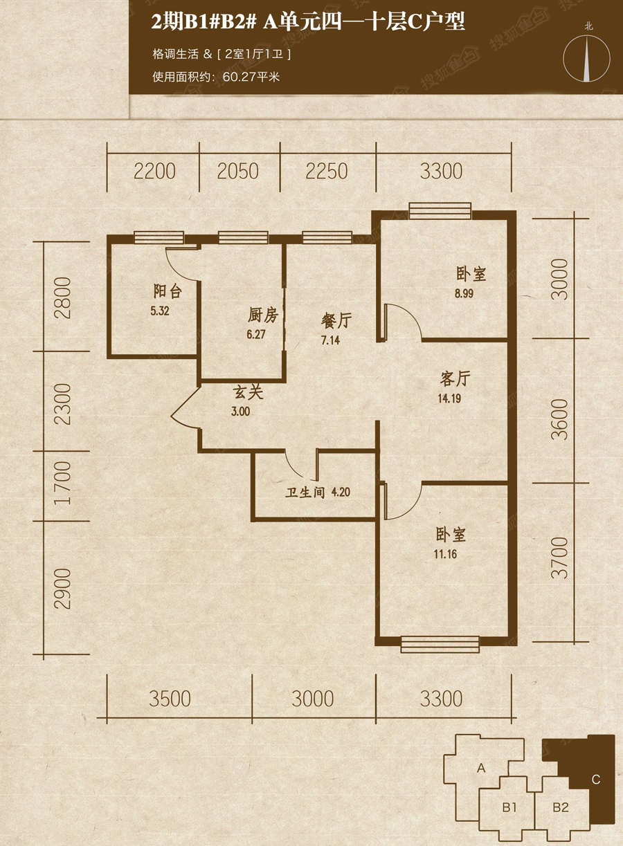 2室2厅1卫-二期B1#B2# A单元4-10层C户型