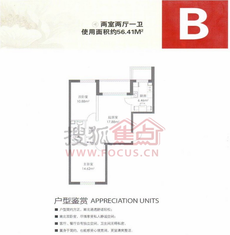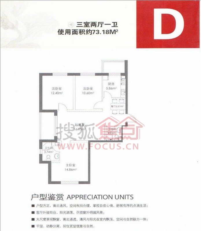 项目共设计有四种户型,49平米两室两厅一卫,三面朝阳,满足青年人生活喜好;56平米两室两厅一卫,66平米三室两厅一卫及73平米三室两厅两卫,南北通透,三面采光,主客卧分开等户型设计满足了不同的业主需求。。