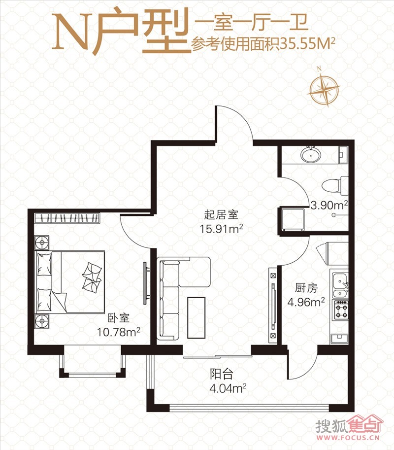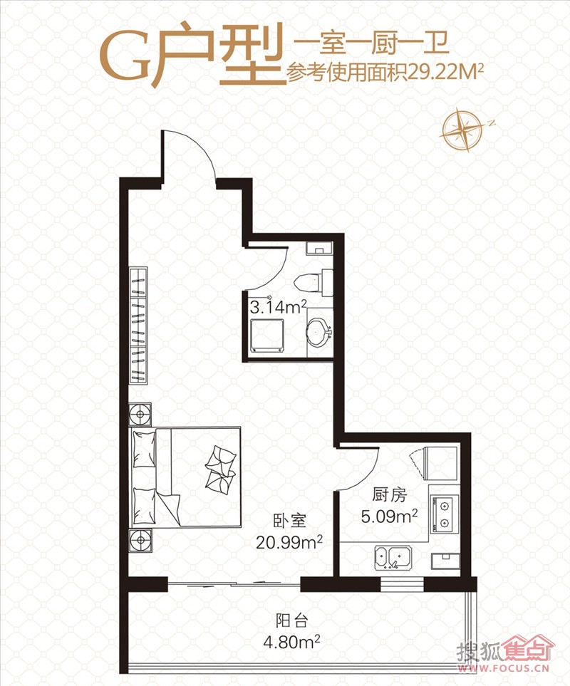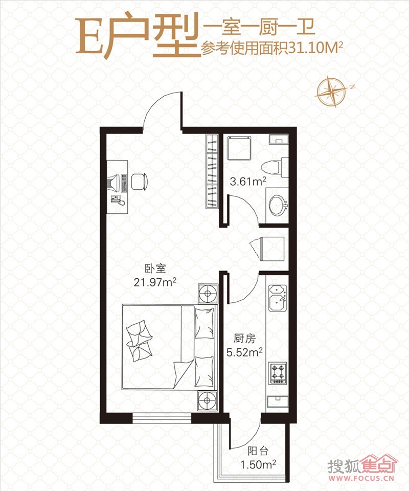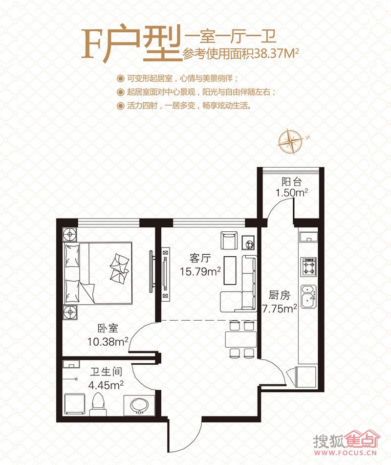 1室1厅1卫-F户型一室一厅一卫38.37㎡户型