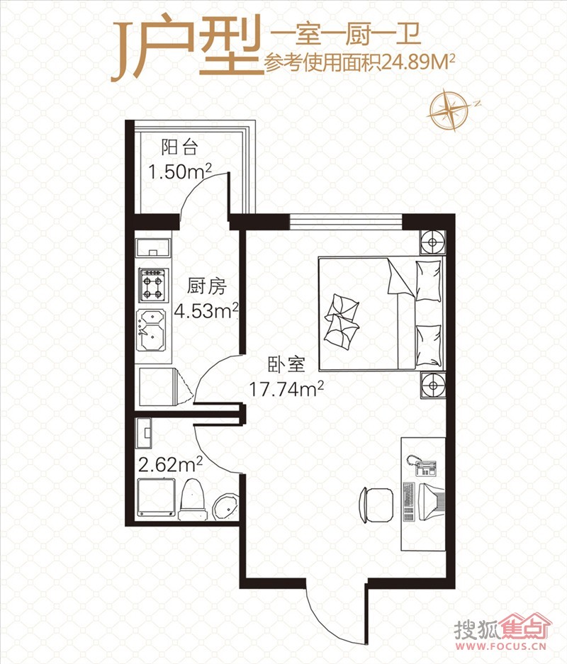 1室1厅1卫-J户型一室一厅一卫24.89㎡户型