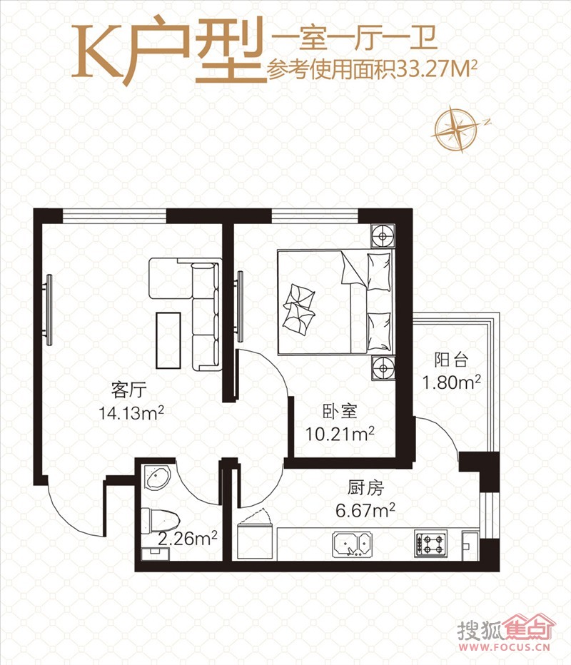 1室1厅1卫-K户型一室一厅一卫33.27㎡户型