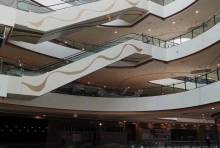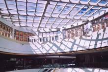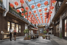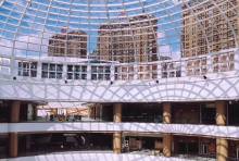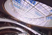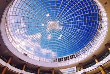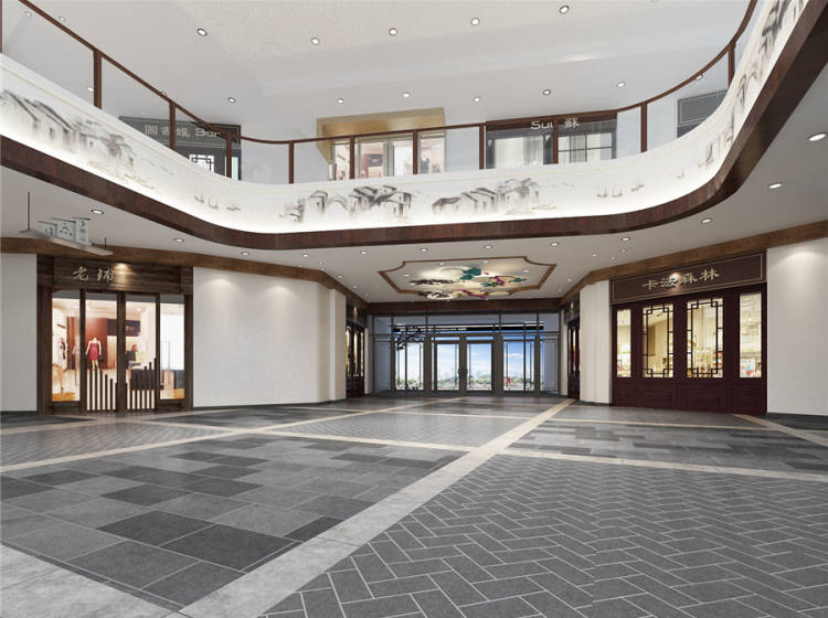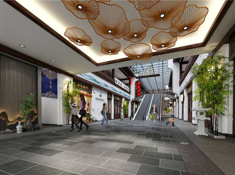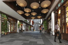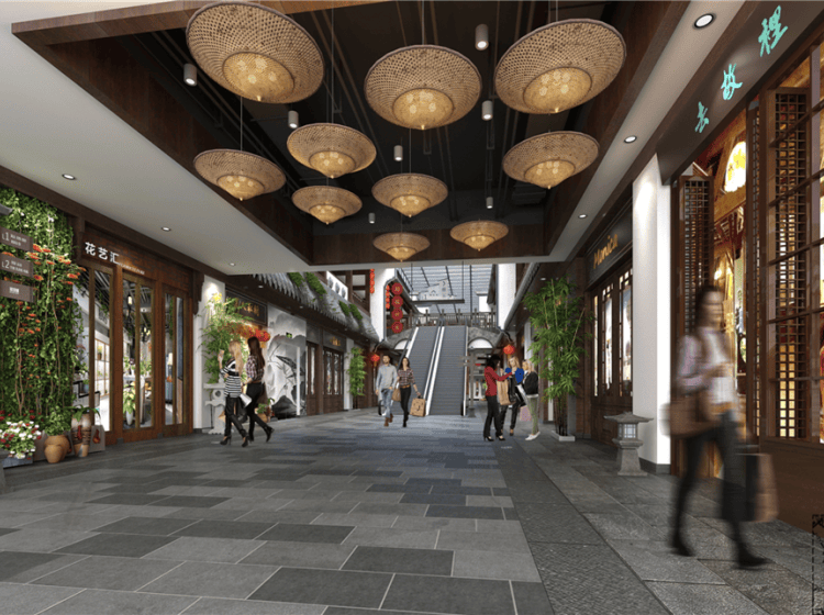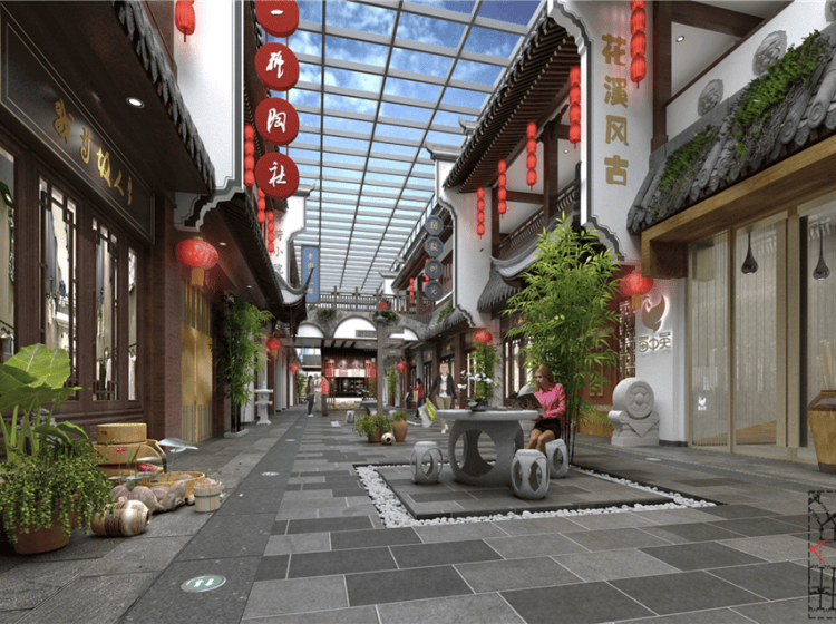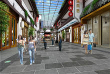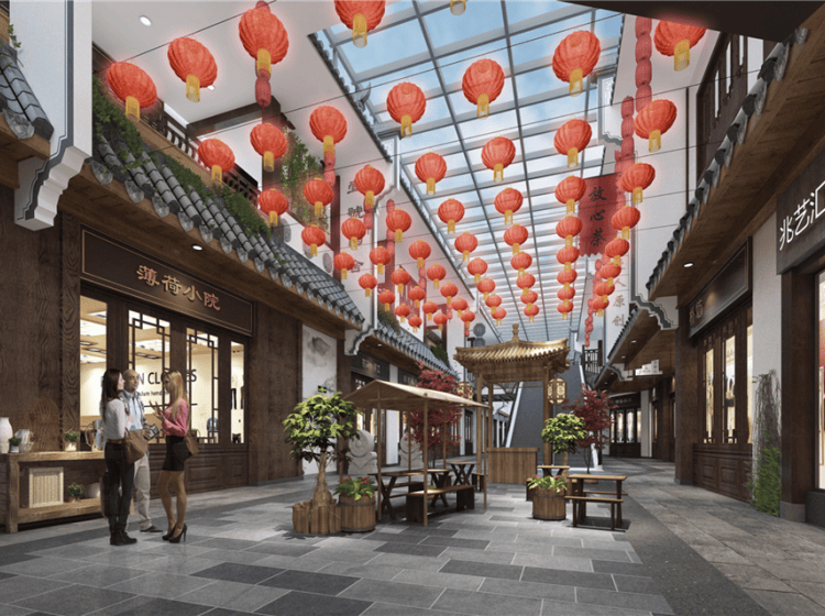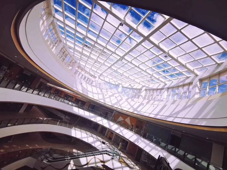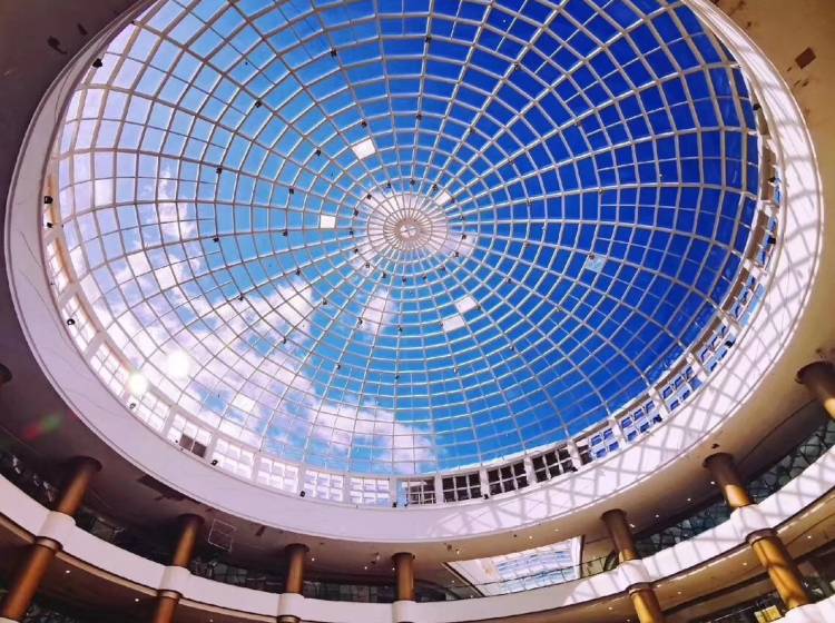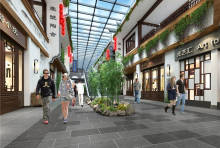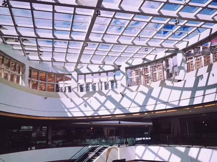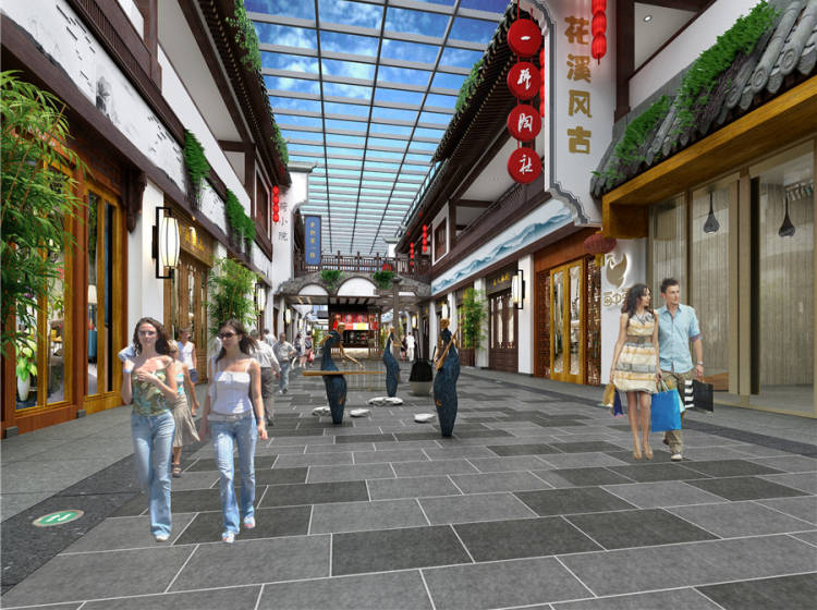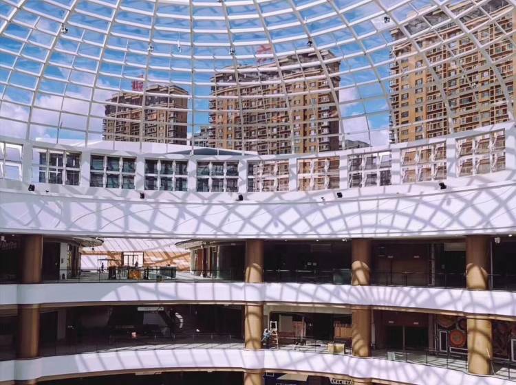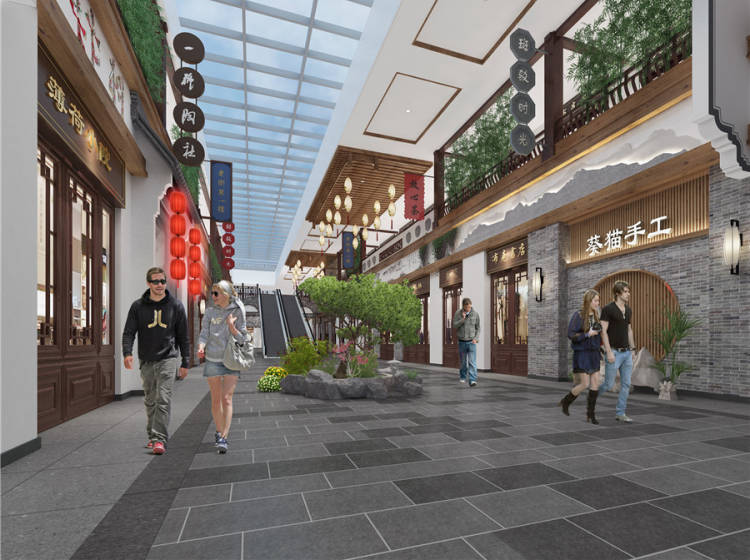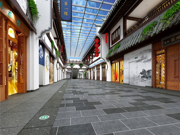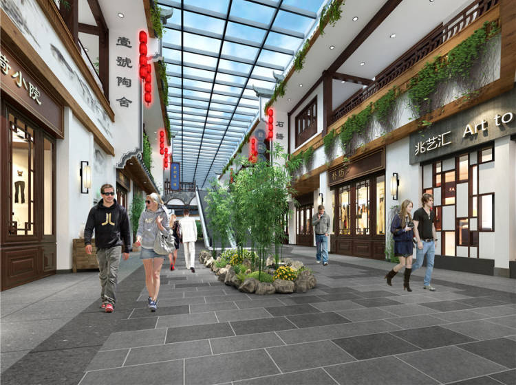 商业步行街共两层,中部为室内设计,顶部采用透明穹顶设计,让消费者在内部逛街时有室外逛街的感觉,但气温却是四季如春的,使顾客不受刮风、下雨等气候和季节变化的影响,尤其是在哈尔滨这种冬季冷,时间长的北方城市,这样的商业街是受欢迎的。