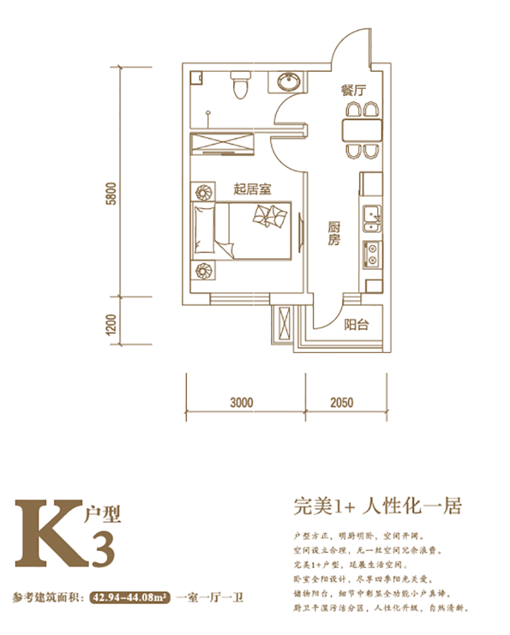 1室1厅1卫-K3-建面42.94-44.08㎡一居