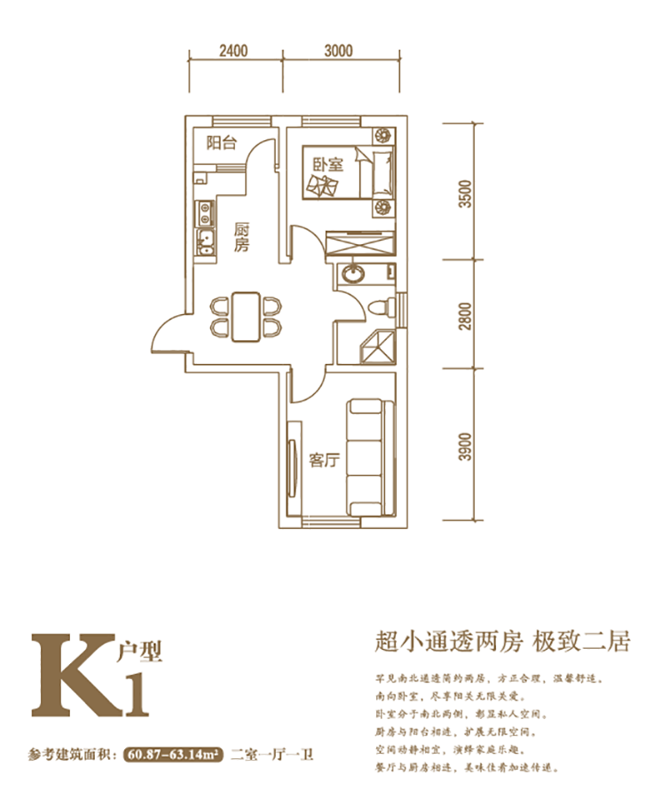 2室1厅1卫-K1-建面60.87-63.14㎡两居