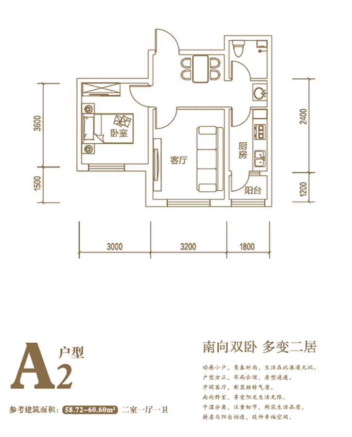2室1厅1卫-A2-建面58.72-60.60㎡两居