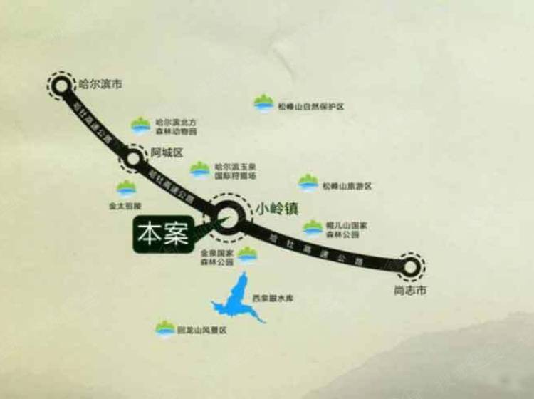 悦然佳境位于小岭镇,小岭镇是一个风景优美、山环水绕的魅力城镇,矿产资源与旅游资源极为丰富。从北边的玉泉滑雪场、狩猎场到东部的西泉眼水库,从哈尔滨野生动物园到横头山美景无不让人流连忘返。