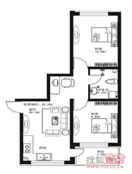 2室1厅1卫-红星丽苑A户型2室1厅1卫使用面积46.34㎡