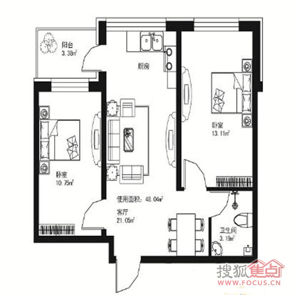 2室1厅1卫-红星丽苑C户型2室1厅1卫使用面积48.04㎡