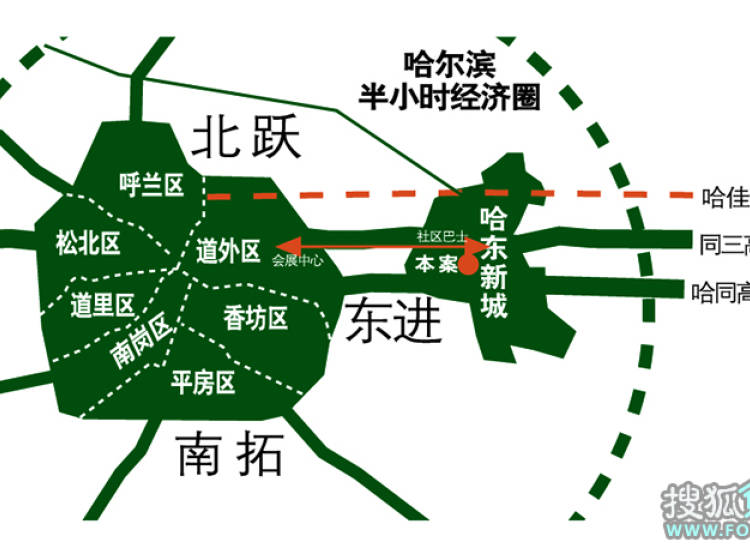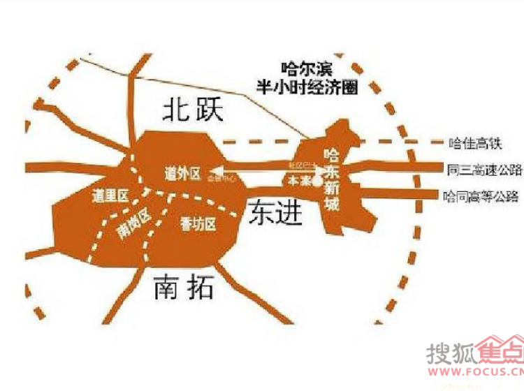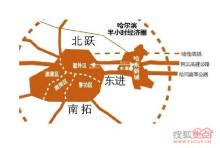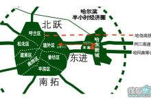 项目位于哈尔滨哈东新城核心位置,兴宾大道与龙宾路交叉口。东临主干道兴宾大道,北临哈佳高铁和哈同高速,西邻30万平米中心湖景观公园和哈东新城金融核心,南邻开发区综合会议中心。