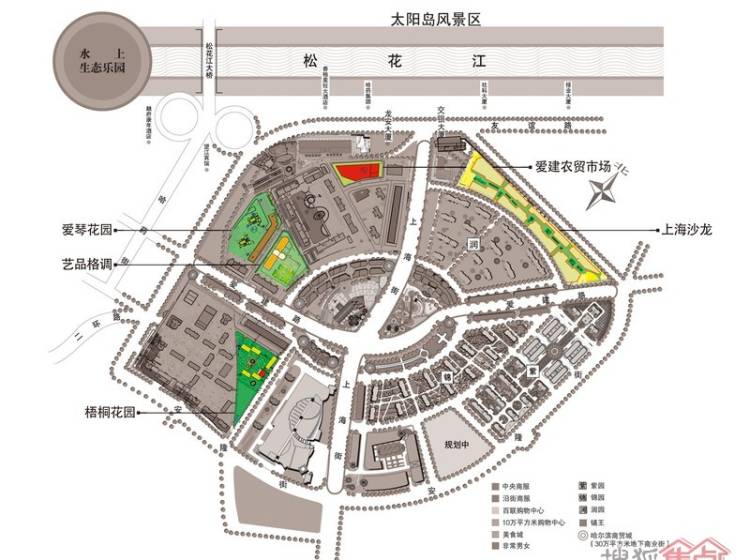 综合商业: 上海沙龙、卓展购物中心、月星家居、居然之家、道里菜市场(爱建店)、中环广场、汇丽美食广场