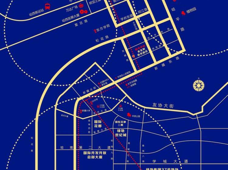 南城第八大道、南城七路、南城第十达大道、哈南九路围合