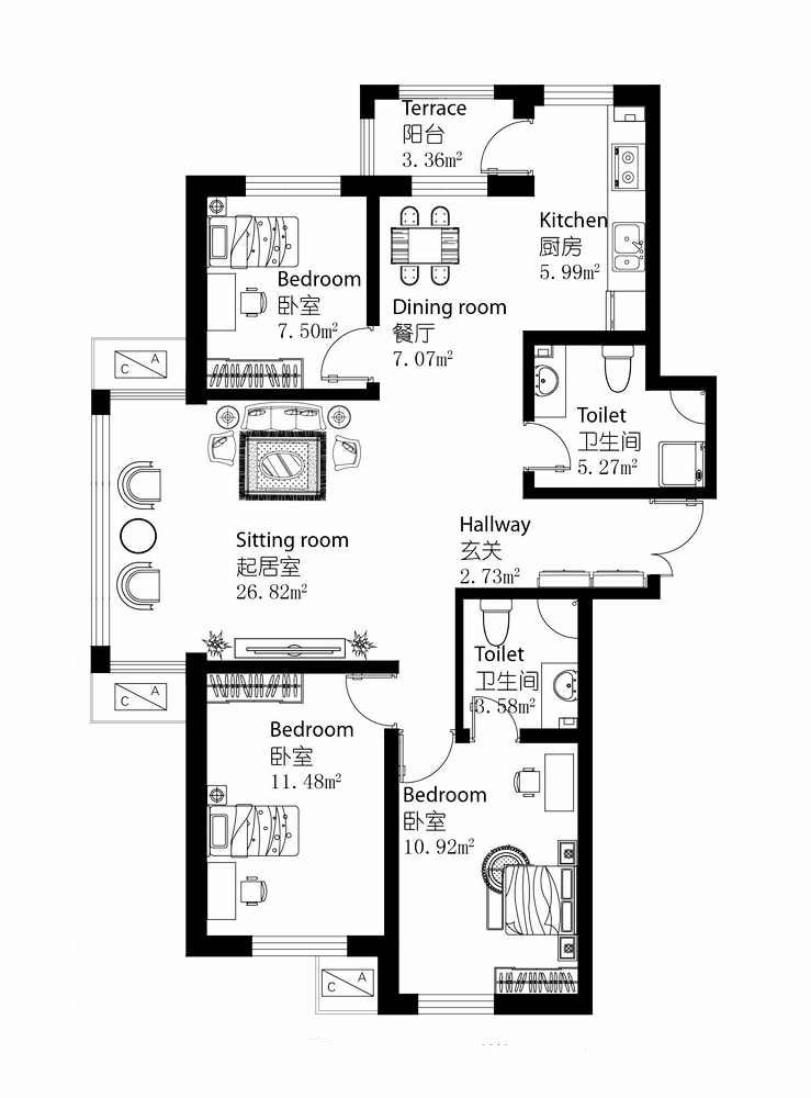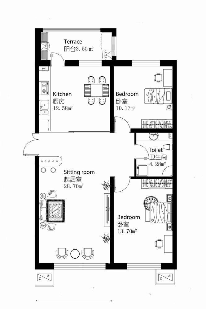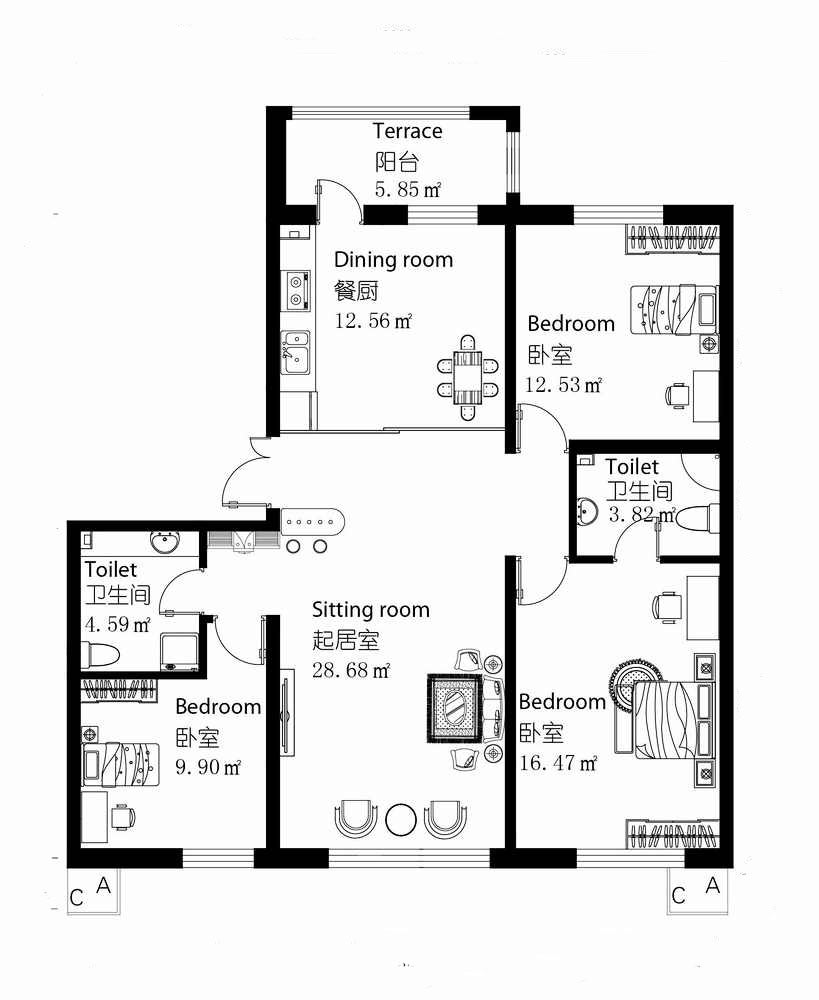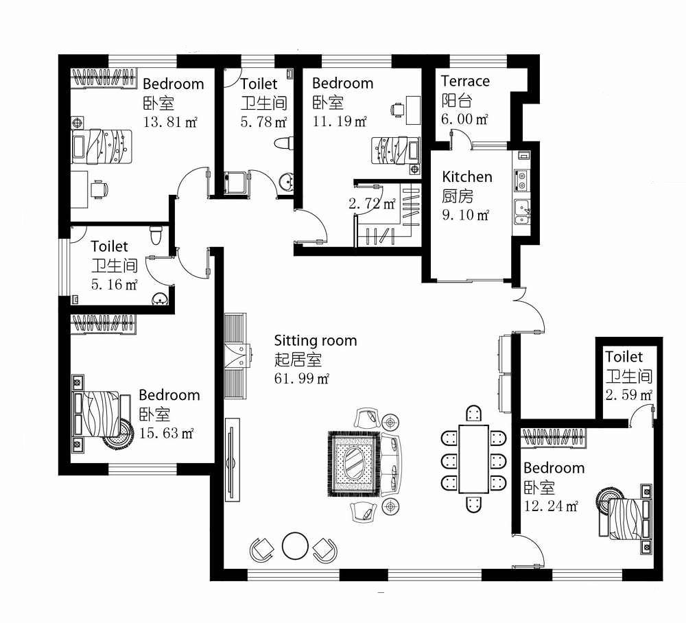 户型设计均采用南北通透,面积从38㎡--130㎡不等,规划有一居、二居、三居、四居。超大的楼间距设计,在充分保证视野的同时,提供良好的采光。。