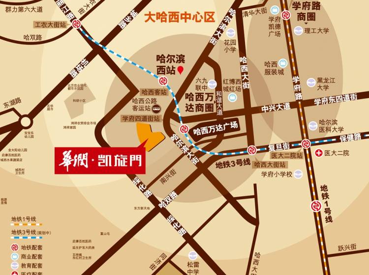 华润凯旋门位于哈西公路客运站的南侧,距离哈西万达购物中心步行约260米。华润置地旨在将“华润凯旋门”打造成集居住、办公、商业于一体的城市综合体,满足您各方面生活所需。华润凯旋门周边有多条公交线路,11路、31路、64路、96路、120路、363路、124路等公交线路,多条公交线路的覆盖为居住在华润•凯旋门的业主出行提供了极大的方便。另外,政府规划的地铁三号线建成以后,出行会更加的便捷,华润凯旋门项目距离秋林商圈10公里;到太平国际机场约27公里。