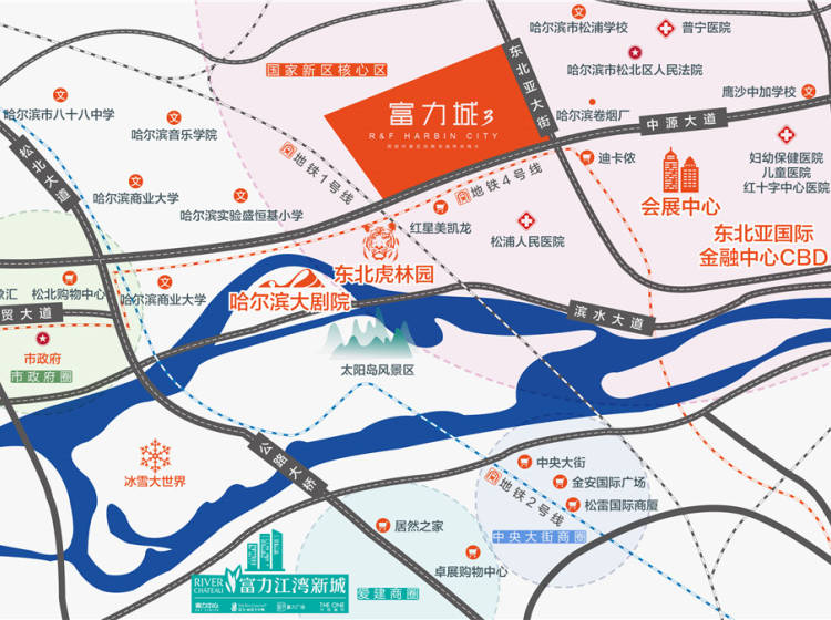 其他:东北虎林园、太阳岛,哈尔滨大剧院、会展中心(规划)、金融CBD(规划)、奥体中心