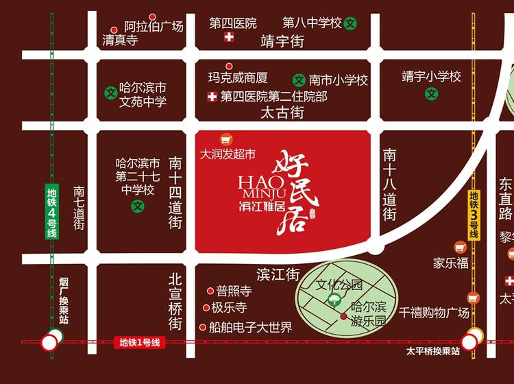 项目周边配套完善,项目西侧紧邻的是南市小学,第80中学 、第65中学,第27中学环绕在侧,距离工程大学也非常近,可满足孩子从幼儿园、小学、中学到大学的一站式教育服务;位于家乐福对面的太平人民医院,南十六道街市四院,为业主的健康保驾护航;哈尔滨文化公园就坐落在项目对面,中华巴洛克历史文化保护街区、靖宇公园、武圣庙、极乐寺距离项目不足一公里,日常休闲娱乐可充分满足。项目周边商业配套齐全,项目左侧延太古街就是玛克威、阿拉伯广场、周边餐饮、银行等一应俱全。