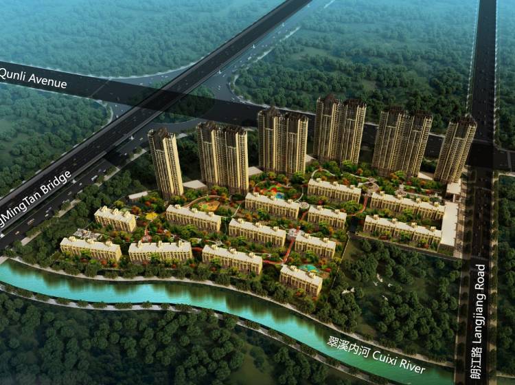 由二环康安路段驶入群力大道,直行至朗江路路口即可到达项目。