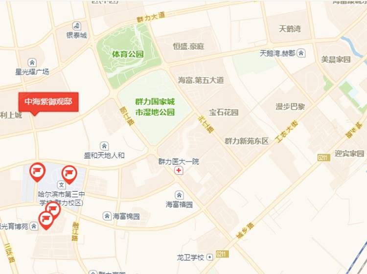 文化配套:群力二小、项目规划千平幼儿园、新三中、轻工学院、山水书城、博物馆群力分馆、奥体中心等。