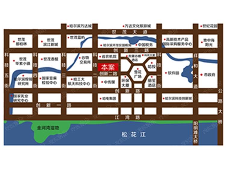 商场:万达城、万达广场、枫叶小镇奥特莱斯;学校:师范附小、哈市九中松北校区、哈尔滨实验学校(小学、中学)、哈尔滨花园小学松北校区;住宅:万达华园、世茂法兰西风情园、世茂.翡冷翠(别墅)、世茂.香缇雅(别墅);酒店:敖麓古雅大酒店、凯宾斯基酒店、香格里拉酒店、万达酒店群;医院:医大四院;银行:国家开发银行、兴业银行、工商银行、建设银行、哈尔滨银行;其他:哈投大厦、中融信托、江海证券大厦、省科技厅大厦、省农科院大厦、哈电国际工程公司、哈电集团、软件园等大中型企业以及政府重点扶持项目。