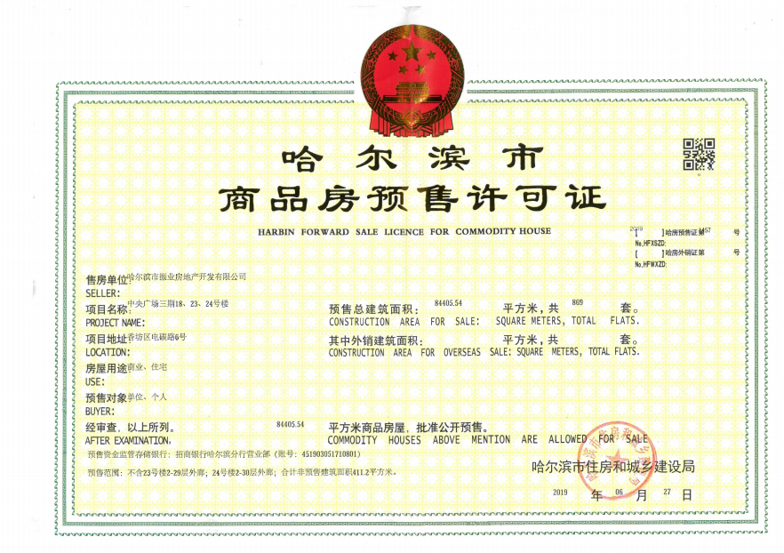 - 【2019】哈房预售证第1457号 详情发证时间 2019-06-27绑定楼栋恒大中央广场三期18、23、24号楼证件照片