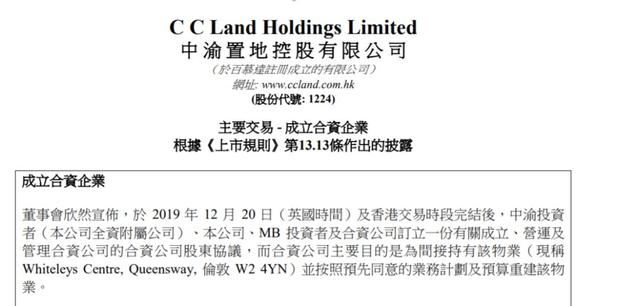 2019年12月20日,中渝置地控股有限公司发布公告宣布,投资1.8亿英镑参与伦敦Whiteleys改造及重建项目。