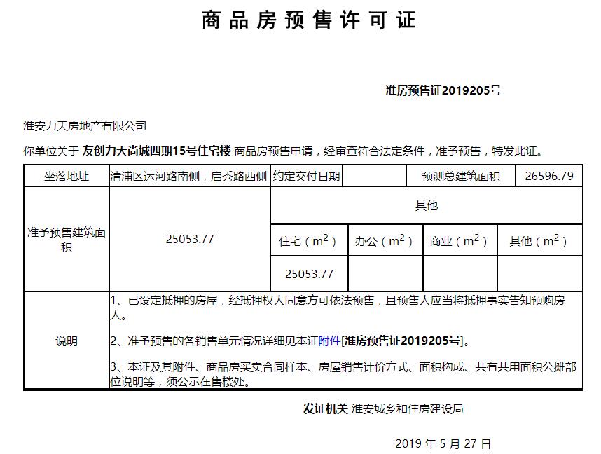 - 淮房预售证2019205号 详情发证时间 2019-05-27绑定楼栋15号楼证件照片