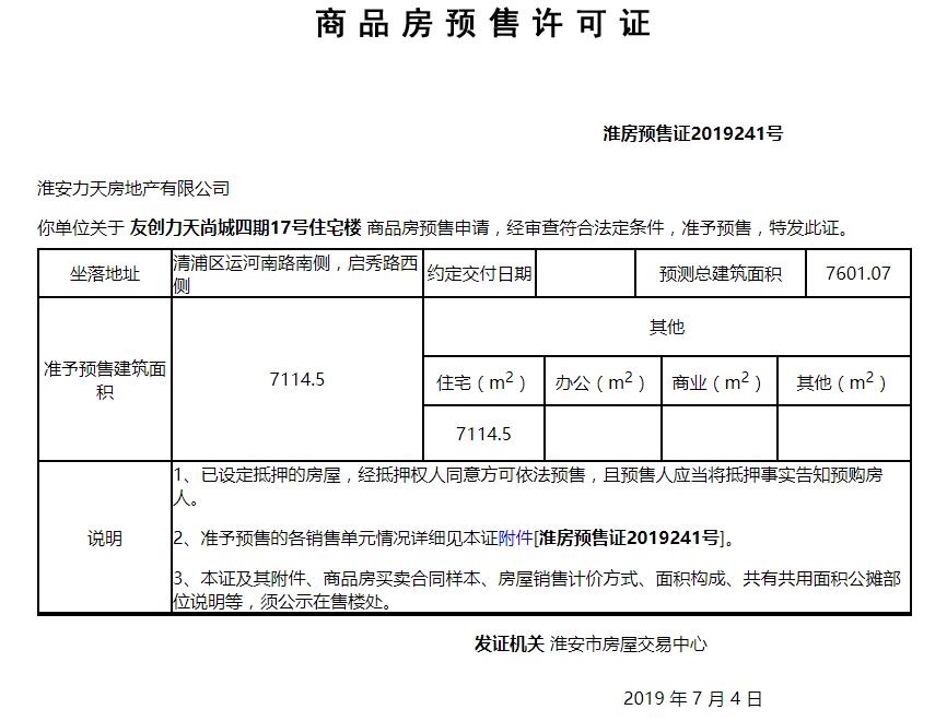 - 淮房预售证2019241号 详情发证时间 2019-07-04绑定楼栋17号楼证件照片