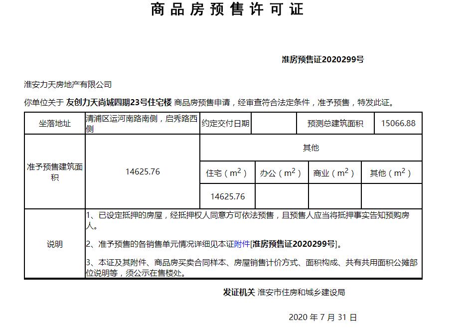 - 淮房预售证2020299号 详情发证时间 2020-07-31绑定楼栋23号楼证件照片