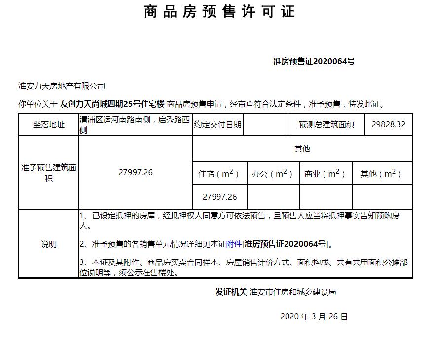 - 淮房预售证2020064号 详情发证时间 2020-03-28绑定楼栋25号楼证件照片