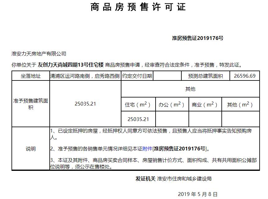 - 淮房预售证2019176号 详情发证时间 2019-05-08绑定楼栋13号楼证件照片