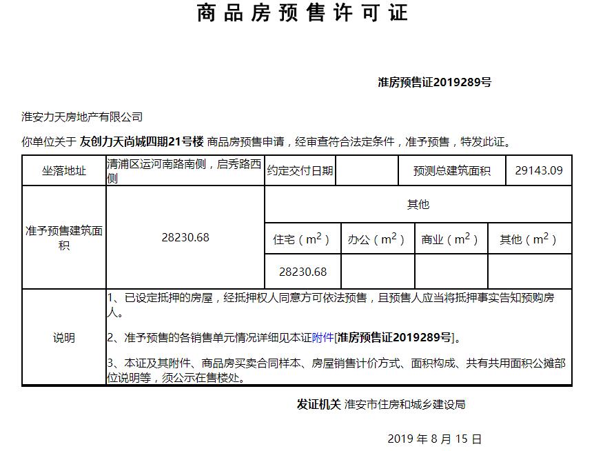 - 淮房预售证2019289号 详情发证时间 2019-08-15绑定楼栋21号楼证件照片