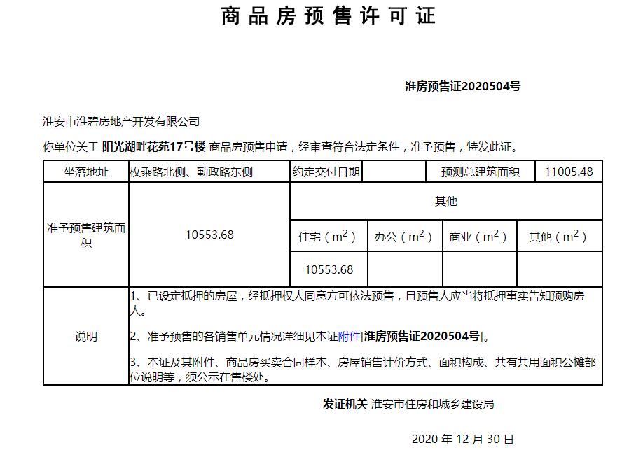 - 淮房预售证2020504号 详情发证时间 2020-12-30绑定楼栋17号楼证件照片