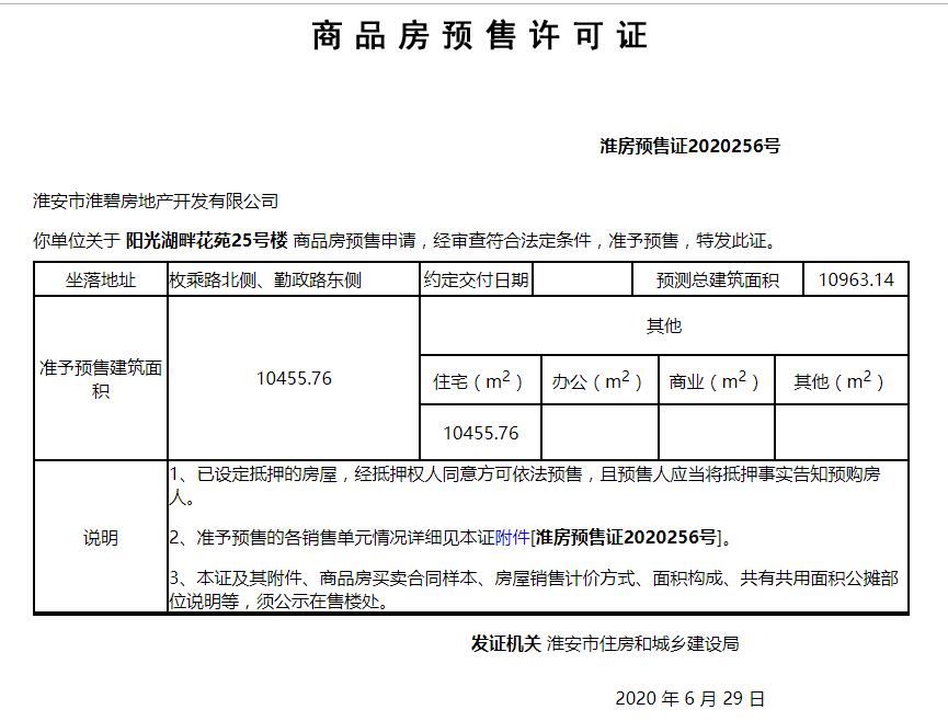- 淮房预售证2020256号 详情发证时间 2020-06-29绑定楼栋25号楼证件照片