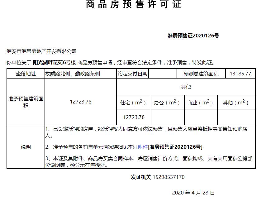 - 淮房预售证2020126号 详情发证时间 2020-04-28绑定楼栋6号楼证件照片
