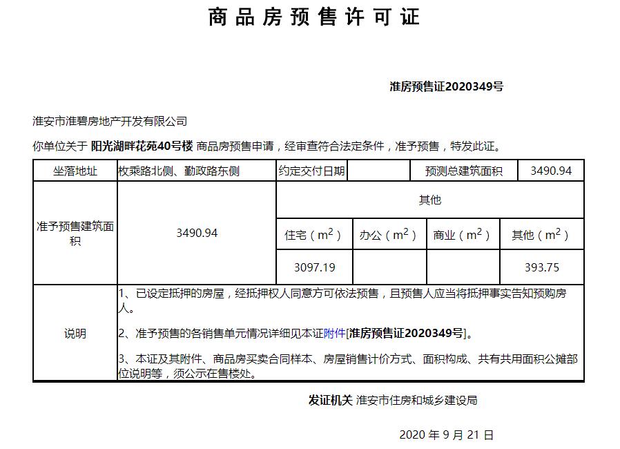 - 淮房预售证2020349号 详情发证时间 2020-09-21绑定楼栋40号楼证件照片