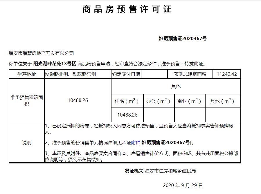 - 淮房预售证2020367号 详情发证时间 2020-09-29绑定楼栋13号楼证件照片