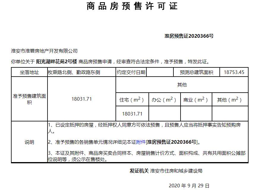 - 淮房预售证2020366号 详情发证时间 2020-09-29绑定楼栋2号楼证件照片