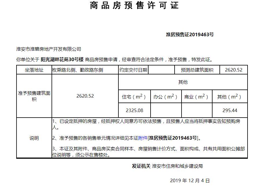 - 淮房预售证2019463号 详情发证时间 2019-12-04绑定楼栋30号楼证件照片